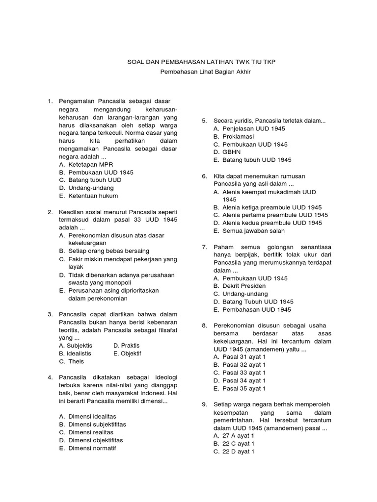 Disisi lain tidak ada salahnya jika kita mempelajari juga Contoh Soal CPNS 2020 UUD 1945. Kumpulan Soal CPNS UUD 1945 dan Amandemen Terbaru Slideshare uses cookies to improve functionality and performance and to provide you with relevant advertising. Soal CPNS TWK Tes Wawasan Kebangsaan dengan topik Soal TWK Hots UUD 1945 dan Tata Perundang-undangan RI merupakan salah satu bagian dari Tes Kompetensi Dasar yang akan diujikan bagi para peserta seleksi TKD CPNS maupun sekolah kedinasan.