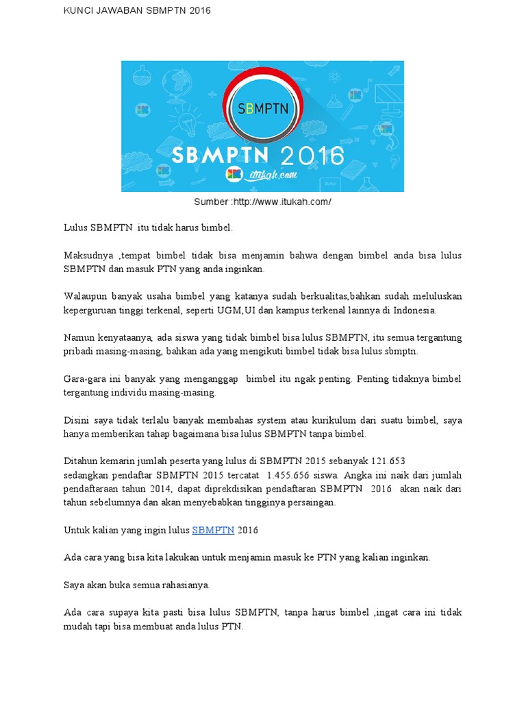 Dan semoga nanti saat mengerjakan soal sbmptn diberikan kemudahan dan akhirnya bisa diterima di perguruan tinggi negeri sesuai yang dinginkan aminnn tags. Kunci jawaban sbmptn 2014 tkpa kode 652 1. Kunci jawaban sbmptn 2014 tkpa matematika dasar bahasa indonesia bahasa inggris tpa kode.