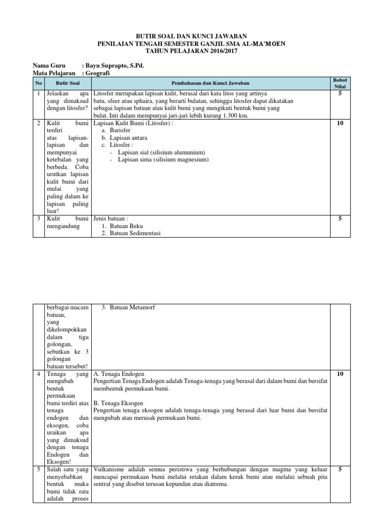 Soal no 6 10 ini materinya masih seputar perkembangan bumi dan dinamika tenaga endogen dan eksogen. Download soal dan kunci jawaban usbn sma ma 2018 2019 pada artikel ini sengaja kami hadirkan beberapa informasi seputar pelaksanaan usbn di sma dan juga kami bagikan link download yang dapat anda gunakan untuk mengunduh beberapa file soal dan kunci jawaban usbn beberapa file ini telah kami kumpulkan dari bebeberapa website dan juga kami dapat dari beberapa guru yang mengajar. Kunci jawaban usbn sma ma tahun 2017 jawa tengah madrasah aliyah ma yatpi godong grobogan.