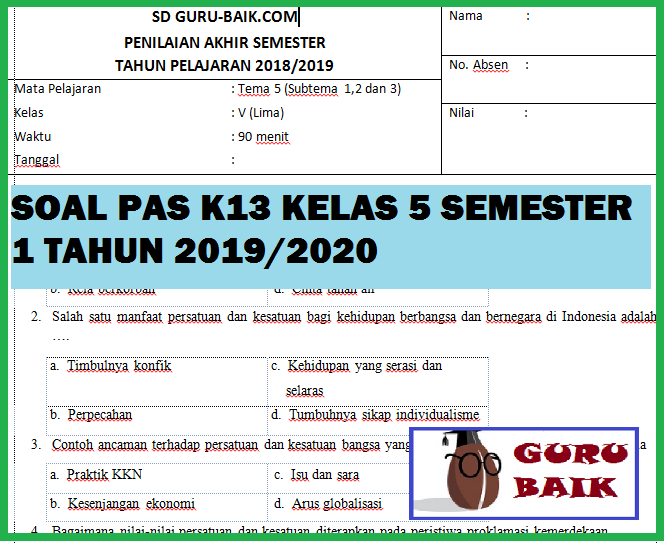 Soal Penilaian HarianUH Kelas 5 Tema 6 K13 Revisi 20202021 Tematik untuk semester 2 ini telah kami lengkapi dengan Kunci Jawaban. Selain itu Soal PAS Kelas 6 Semester 1 ini juga dapat dimanfaatkan oleh siswa sebagai sumber belajar latihan mengerjakan soal sebagai langkah persiapan. Download Soal UTS Bahasa Indonesia Kelas 5 Semester 1 Berikut ini soal terbaru Soal UTS Bahasa Indonesia Kelas 5 Semester 1 Terbaru Tahun Ajaran 20182019 Kunci Jawaban Room I 1b 2a 3b 4a 5b 6a 7d 8c 9b 10a 11b 12c 13c 14a 15d 16b 17c 18b 19b 20c 21a 22d 23c 24b 25d 26a 27a 28a 29b 30b.