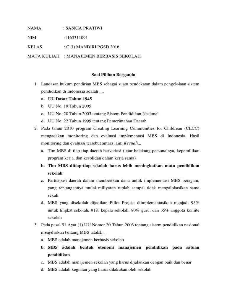 Soal Dan Kunci Jawaban Manajemen Berbasis Sekolah Revisi 2021