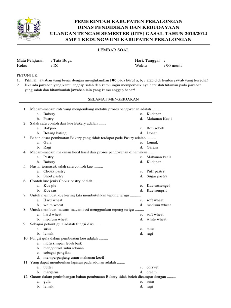 Majelis pendidikan dasar dan menengah cabang muhammadiyah dayeuhluhur smp muhammadiyah 1 alamat. Saat pembuatan dilakukan. Soal un tata boga by izzah1hs in types gt school work and zhaa jasa boga 4427 120 menit 19 maret 2019 pilihan ganda 40 soal a petunjuk umum 1.