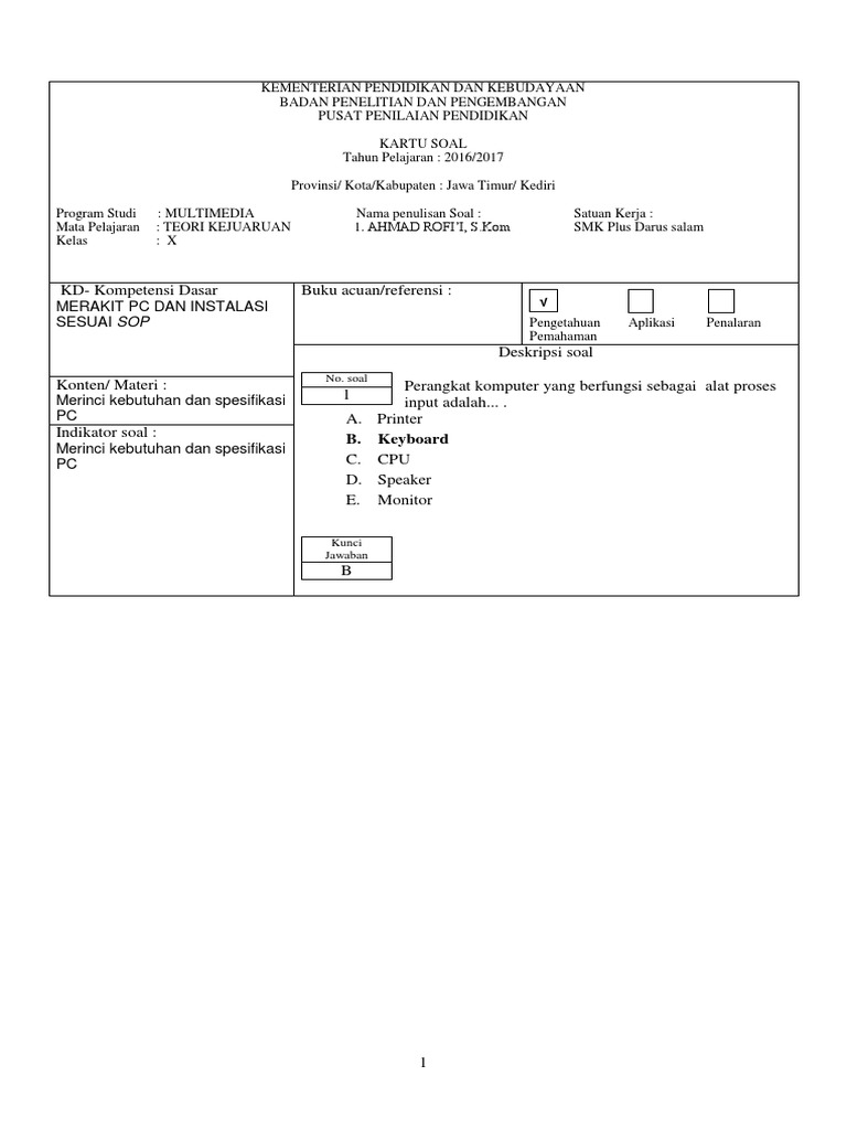 Soal teori kejuruan multimedia dan kunci jawaban 2017. Soal produktif teori kejuruan multimedia smk kelas xi beserta kunci jawabannya by share ilmu pendidikan 17 may 2020 post a comment jurusan multimedia adalah salah satu jurusan yang ada pada sekolah menengah kejuruan smk. Contoh soal un 2017 kunci jawaban ujian nasional biologi 2018 ujian nasional latihan soal ujian nasional tkj smk guru ilmu sosial. Latihan soal ujian nasional un teori kejuruan tkj smk 2017 soal dan jawaban teori kejuruan tkj pdf ruang belajar siswa kelas 8 soal unbk produktif tkj.