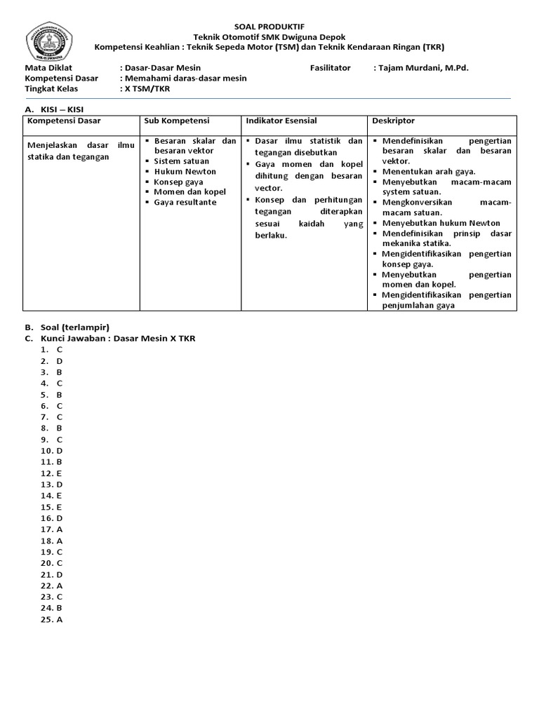 Soal dan kunci jawaban ujian semester sbbb tkr. Soal dan kunci jawaban soal engine dan komponennya otomotif kendaraan ringan dan sepeda motor. 348393030 soal dan kunci jawaban soal engine dan komponennya otomotif kenda pdf.