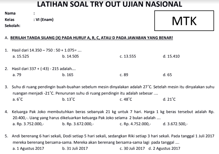 Soal Try Out Matematika Smp Dan Kunci Jawaban