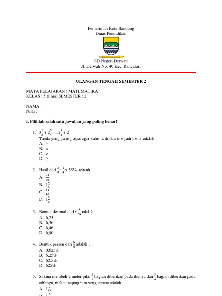 Soal uts matematika kelas 5 semester 1 kurikulum 2013 revisi 2017Soal uas matematika kelas 5 sd semester 1 ganjil dan kunci jawaban 31 oktober 2017 admin bimbel brilian 0 komentar a. Soal Dan Jawaban Sd Kelas 4 5 Dan 6 Jumat 1 Mei 2020 Materi Belajar Dari Rumah Tvri Tidak. Soal Matematika Kelas 5 SD Semester 2.
